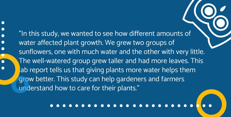 The abstract above explains what the study aimed to discover. It tells how different amounts of water affect plant growth and briefly describes the experiment’s setup. It involved growing two groups of sunflowers, one with lots of water and the other with very little.